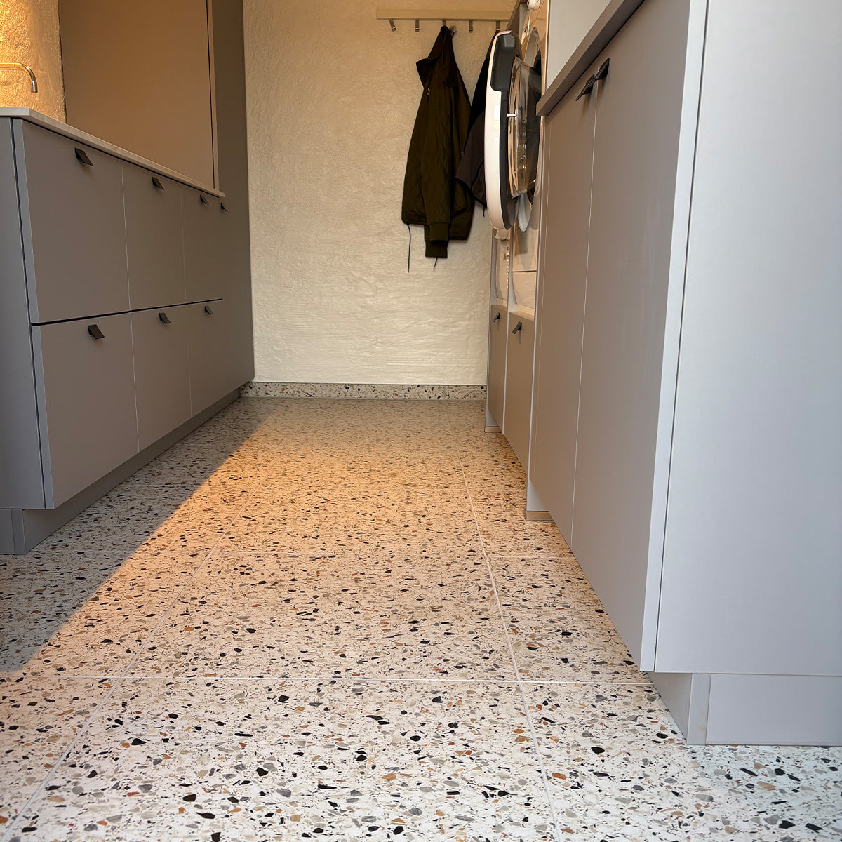 Terrazzolooket har altid været smukt, og er nu blevet meget moderne igen. Dansk Flise Lager har fået denne smukke terrazzolook flise på lager, så alle nu har muligheden for at få det smukke naturlige look hjemme.