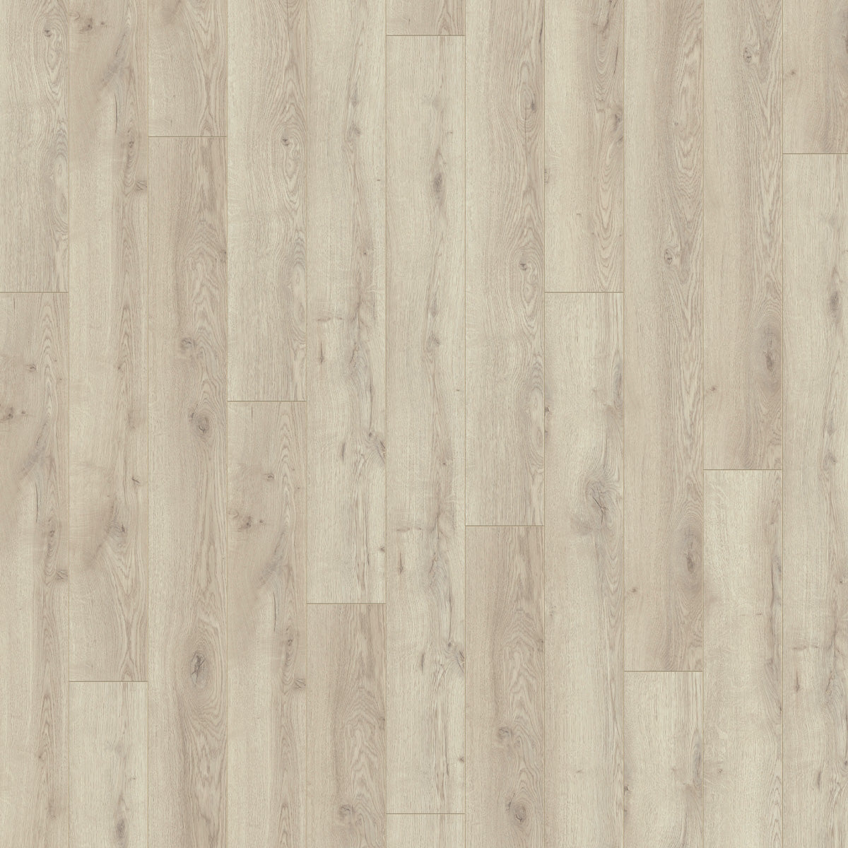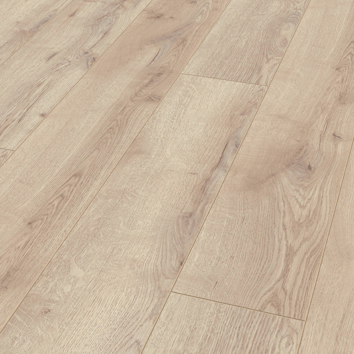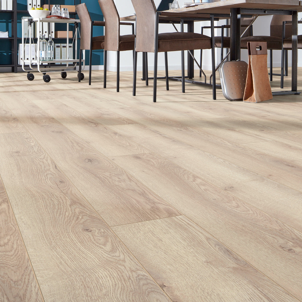 Dette laminatgulv er et skabt til at modstå hverdagens slid uden at gå på kompromis med den æstetiske elegance. Med sine ekstra lange planker og den delikate, beige-tonede overflade skaber dette gulv en lys, luftig og moderne atmosfære i ethvert rum.
